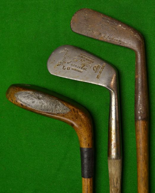 D Anderson "Special" stained persimmon long nose socket neck putter with an elongated black fibre sole insert^ fitted with a full length leather grip t/w 2x irons a JH Taylor Autograph ladies mashie and Gibson Star R.H de Montmorency push iron- one gripped (3)