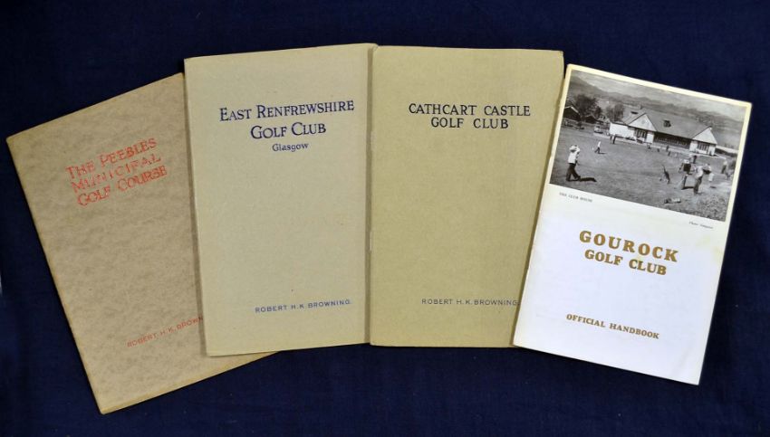 3x Scottish golf club handbooks from the 1930s onwards to include 3x Robert H.K Browning "The Peebles Municipal Golf Course" issued 1934^ "East Renfrewshire Golf Club^ Glasgow" issued 1937^ "Cathcart Castle Golf Club" issued 1937 all in their original paper wrappers slight discolouration to edges and minor bruises otherwise overall (G) plus a later "Gourock Golf Club" issued in 1959 in the original glossy covers (G) (4)