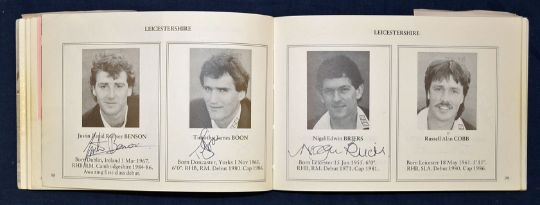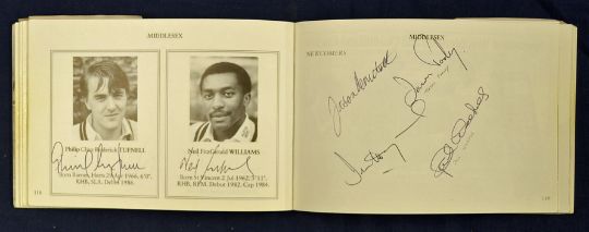 1988 Signed'The Carpone Gallery of Cricketers' handbook by Bill Frindall signed by the majority of the players such as K Barnett^ M Jean-Jacques^ K Fletchser^ N Hussain^ G Gooch^ D Graveney. I Butcher^ M Nicholas^ C Greenidge^ G Cowdrey^ D Hughes^ M Crawley^ M Atherton^ M Gatting^ P Tuffnell^ to name but a few^ heavily signed^ worth inspecting^ over 240+ autographs