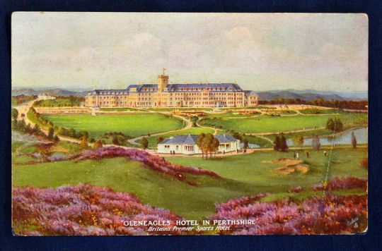 Gleneagles Golf Hotel coloured postcard titled "Gleneagles Hotel in Perthshire - Britain's Premier Sports Hotel" - Tuck's and annotated on the back "Gleneagles Hotel is the new Palace among the Scottish Mountains opened by the L.M. & S.R. under the direction of Arthur Towle." - unused.