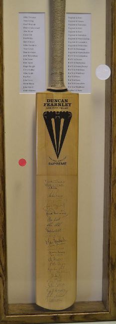 Rare 1974 England Test Trials signed Cricket Bat - full size Duncan Fearnley cricket bat signed to the front by 22 England players to incl Denness^ Greig^ Boycott^ Underwood^ Knott^ Old^ Willis^ Hendrick^ Tony Lewis^ Amiss^ Snow^ Lever^ Edrich et al - played at New Road Worcester May 1974 c/w handmade quality light stained wooden case overall 30 x 98cm. Note this is the only known England Trials match