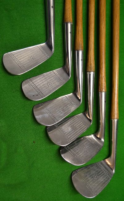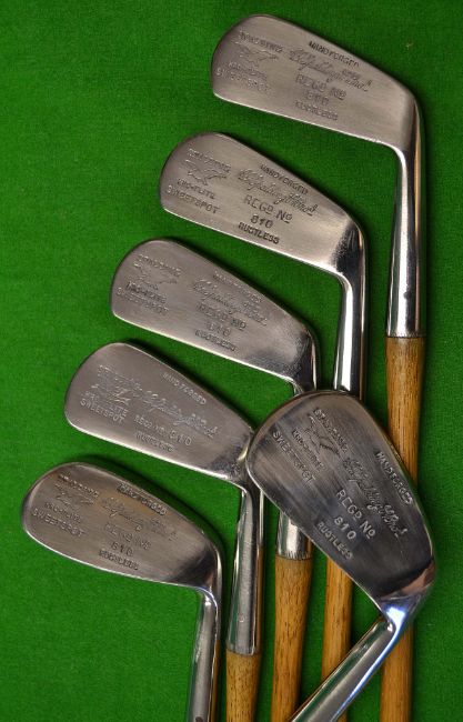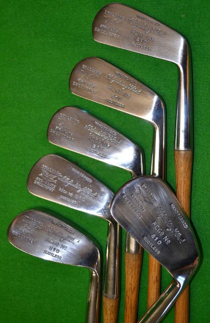 Superb^ rare matching set of 6x Spalding Kro-Flite'Sweetspot' polished rustless irons regd no 810 - numbers 2^ 3^ 4^ 5^ 6 and 7^ fitted with the original full length leather grips^ these ready for play irons have the following lofts making a perfect playing set^ no 2 iron - 24° loft^ no 3 - 27°^ no 4 - 32°^ no 5 - 37°^ no 6 -42° and no 7 - 48°