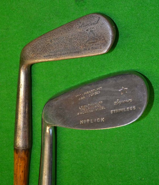 2x Left hand irons including a large head niblick with the Gibson'Star' mark and a Mitre brand mashie both fitted with full length grips