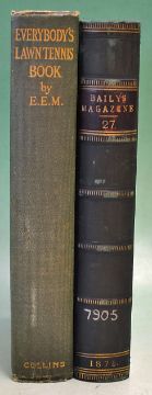 Rare bound Volume number 27 of Baily's Magazine for 1875 featured inside on pages 138-140 are a contemporary copy of the^ "Laws of Lawn Tennis - Revised by the M.C.C." as issued on 24th. May 1875. The rules continued to adopt the'Hour-glass' shaped court^ 15-point games^ and the net was still 5 feet high at the posts and 4 feet at the centre. The volume is an ex-library copy with the usually associated markings and some marks and chips to the covers. Included with this lot is a copy of'Everybody's Lawn Tennis Book by'E.E.M.' dated 1923 (2)