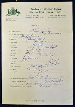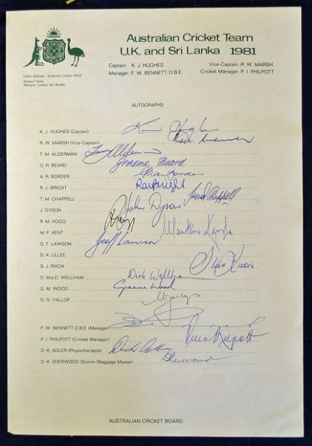1981 Australia Cricket tour to UK and Sri Lanka signed team sheet including 19 signatures such as Hughes^ Marsh^ Beard^ Border^ Bright^ Chappell^ Dyson^ Hogg^ Kent^ Lawson and others^ in ink^ with minor folds otherwise G condition