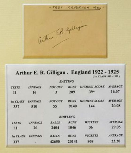 Arthur E. R. Gilligan (England Cricket Capt. 1924/25) signed album page dated 1934 c/w cricket career statistics mf&g overall 25 x 28cm