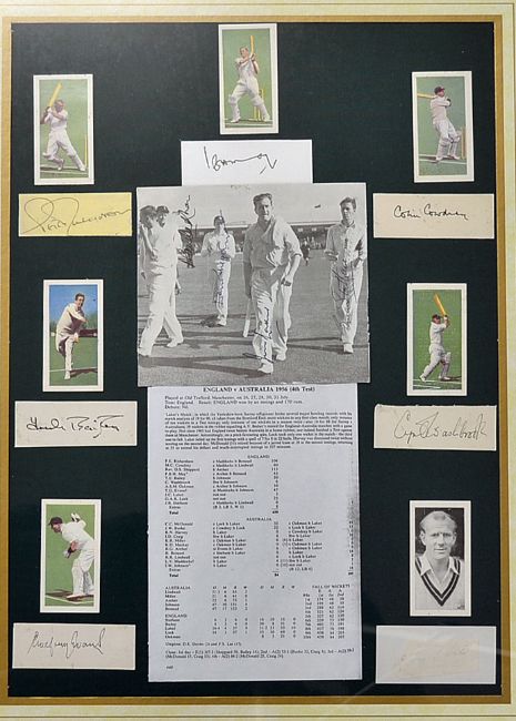 Nice 1956 England v Australia'Laker's Match' signed cricket ephemera montage consisting of a copy of the scorecard^ autographs include J Laker^ C Cowdrey^ P Richardson^ T Bailey^ T Evans^ C Washbrook^ G Lock^ J Statham^ D Shepphard^ A Oakman^ and P May^ mf&g^ measuring 46 x 56cm. Note:'Laker's Match'^ in which the Yorkshire- born Surrey offspinner broke several major bowling records with his match analysis of 19 for 90^ all taken at the Stretford end; most wickets in any first-class match; only instance of ten wickets in a Test innings; only instance of ten wickets in a season twice - also 10 for 88 for Surrey v Australians; 39 wickets in the rubber equalling A V Bedser's record for England -Australia matches with a game to play.