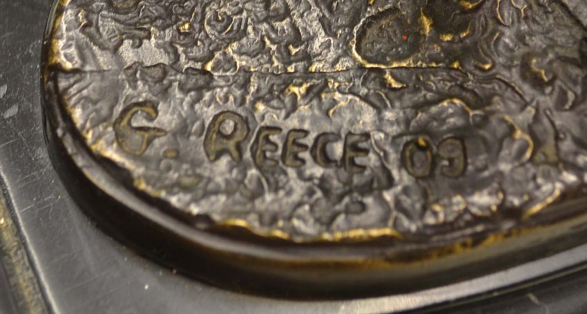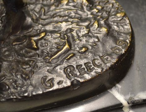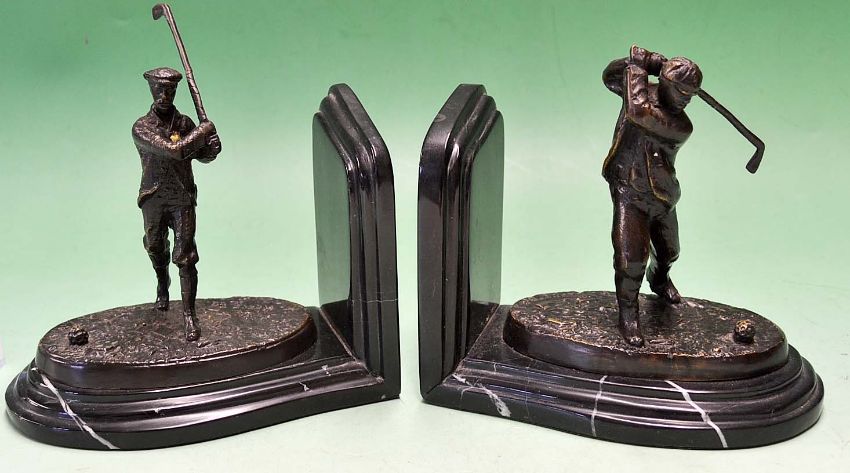 Pair of early bronze golfing bookends c1909 - each with a Victorian golfing figure on naturalistic oval bases and mounted on black marble bookends and bases - both signed G. Reece'09 overall 7"h x 6.75" w max