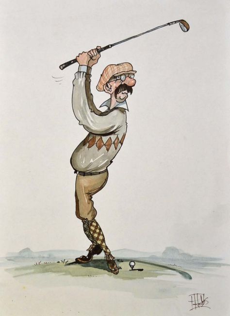 P Hobbs signed golf sketch comprising original pen and ink with water colour of an amusing golfing character - overall 11.5" x 8.25"