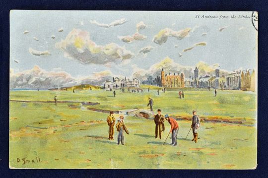 Early St Andrews Links coloured golfing postcard titled - "Picturesque St Andrews". From the original'St Andrews from the Links' painting by D. Small of players on the green with the Swilcan Bridge behind and the Clubhouse / Grand Hotel in the background - Valentine's Series. Used with good St Andrews cancellation dated December 11th 1903.