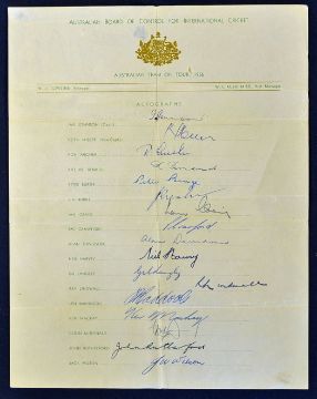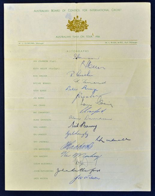 1956 Australian tour to England signed cricket team sheet including Johnson^ Miller^ Archer^ Benaud^ Burge^ Burke^ Craig^ Crawford^ Davidson^ Harvey^ Langley^ Lindwall^ Maddocks^ Mackay^ McDonald^ Rutherford and Wilson^ with G signatures^ some fold marks^ and glue marks to the rear A/G