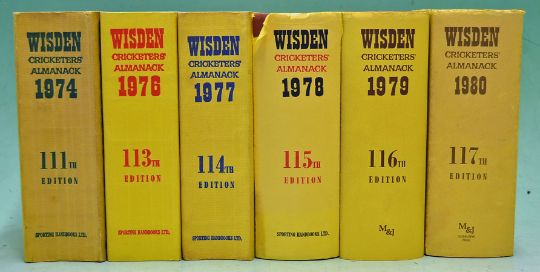 Wisden Cricketers' Almanacks 1974^ 1976-1980 with 74^ 76 & 77 all softbacks with original linen cloth covers and all in G condition with light wear marks^ t/w 78^ 79 & 80 HB with DJs and in G condition (6)