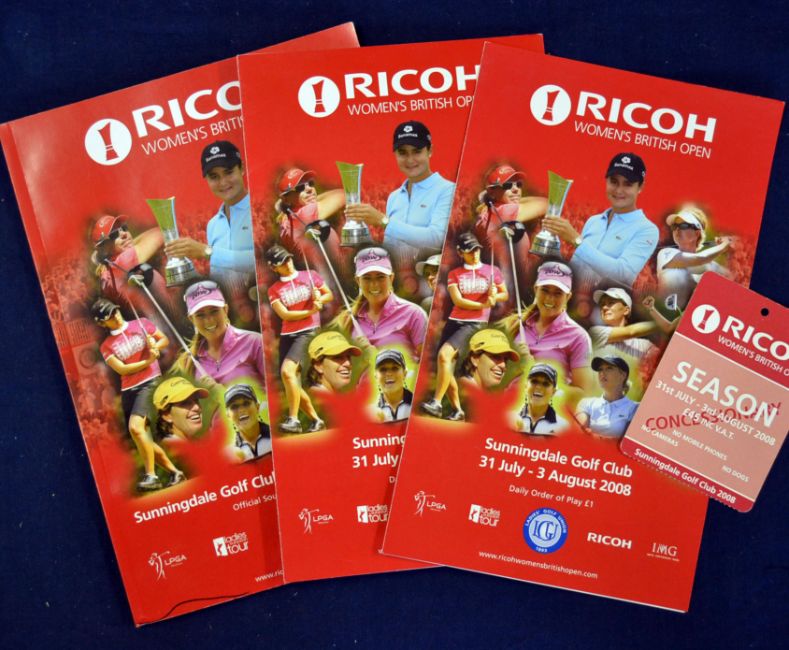 2008 Women's British Open Golf Championship multi signed programme - played at Sunningdale and virtually fully signed by most of the players to their player profiles throughout to incl Ochoa^ Sorenstam^ Creamer^ Kim^ Inbee Park^ Webb^ Davies^ Kerr et al - in all 64 signatures c/w 2x draw sheets and season ticket - overall (VG)