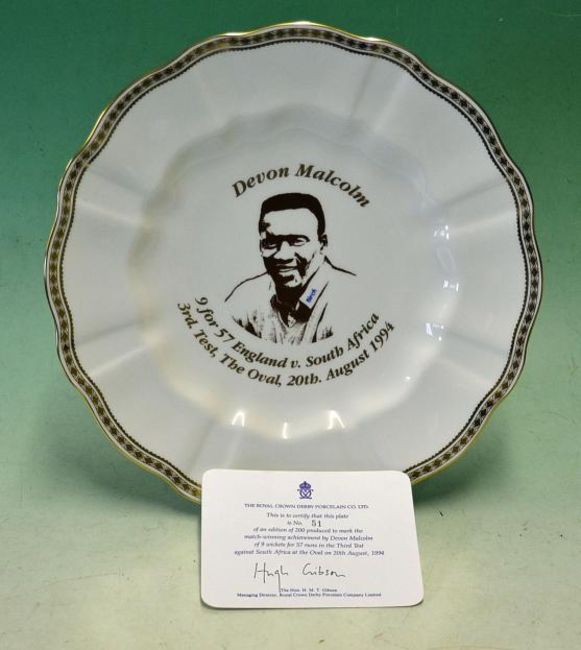 Devon Malcolm England Cricket Commemorative plate - Royal Crown Derby bone china and gilt plate commemorating the match winning Achievement of 9 wickets for 57 runs in the third Test against South Africa at The Oval on 20th August 1994 ltd ed no. 51/200 c/w c.o.a and makers original box - overall 10.5" max