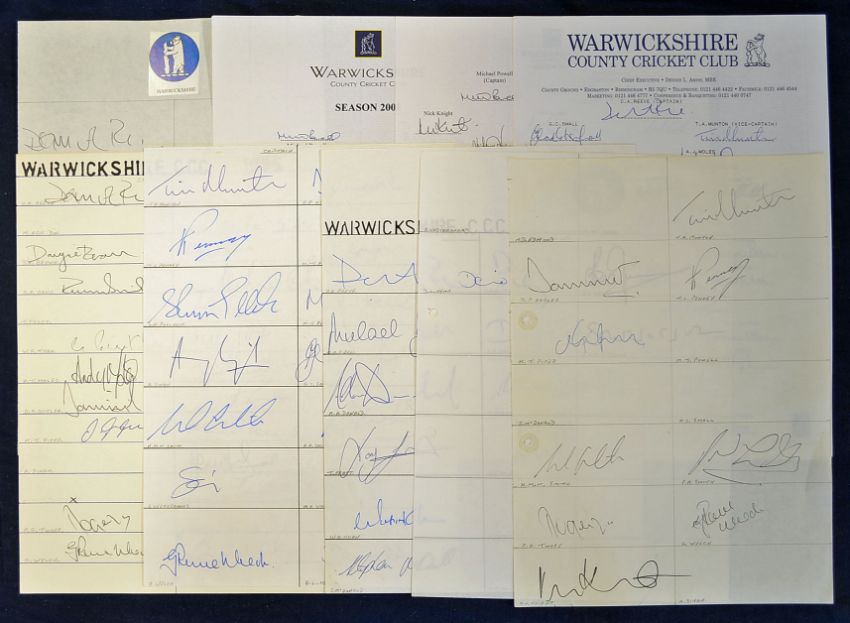 Selection of 1995 onwards Warwickshire CCC signed team sheets and cards with players such as Dermott^ Reeve^ Giles^ Donald^ Knight^ Bell^ Lara^ Trott^ Asif Din and many more #145 autographs (9)