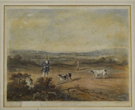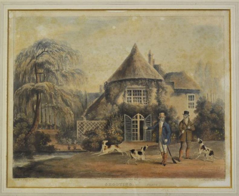 Early 19th c Shooting scene engravings - set of 4 coloured plates from the originals by D Wolstenholme engraved by T Sutherland and publ'd by Ackermann The Strand 1823 - in mf&g overall 18x21" some foxing and stains