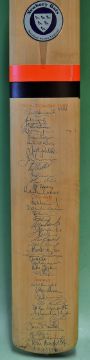 1983 New Zealand^ England and Surrey signed cricket bat heavily signed with 40 autographs^ with'Newberry Bats^ Northian Sussex England' sticker to the front and back of the bat^ all signed in ink and includes players such as (NZ) Howarth^ Edgar^ Crowe^ Wright^ Webb^ Cairns^ (Eng) Gower^ Lamb^ Gould^ Marks^ Botham^ Tavare^ (Sur) Knight^ Richards^ Smith^ Butcher^ Waterman and more^ full size bat with good grip soft'V' centre section and in good condition