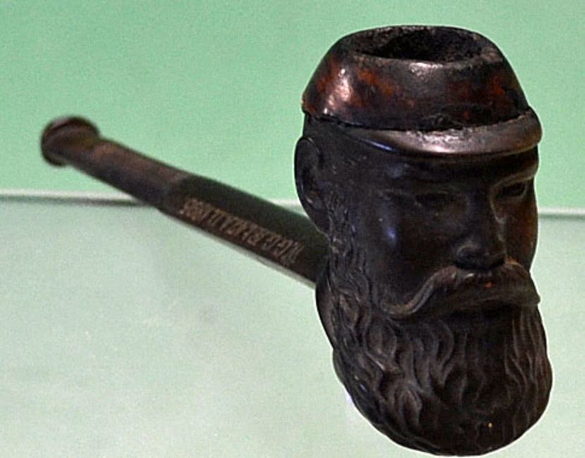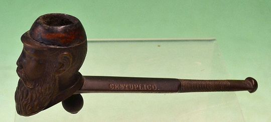 W G Grace shaped Centuplico wooden pipe having a W G Grace head bowl^ the stem is a carved as a bat with a ball to the base^ measuring 5 ½"^ having'Centuplico' and W G Grace at 47 AD 1895 engraved to the bat^ some minor cracking to the top otherwise in good condition