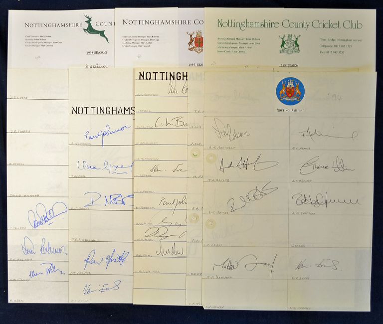 Selection of 1994 onwards Nottinghamshire CCC signed team sheets and cards featuring Robinson^ Adams^ Johnson^ Bicknell^ Cairns^ Afzaal and many ore^ #140 autographs (8)