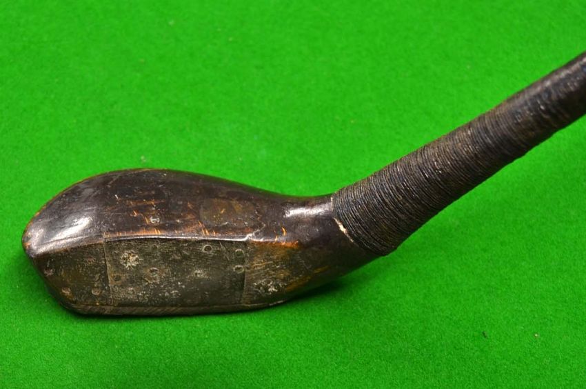 T Morris Longnose spoon in dark stained beech wood stamped to the crown with the maker's mark c1885^ modified to be fitted with a full length whole cane shaft^ c/w good full length hide grip and thickened cloth underlisting - well used club with some repairs - must have been a player's favourite club!!
