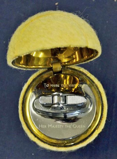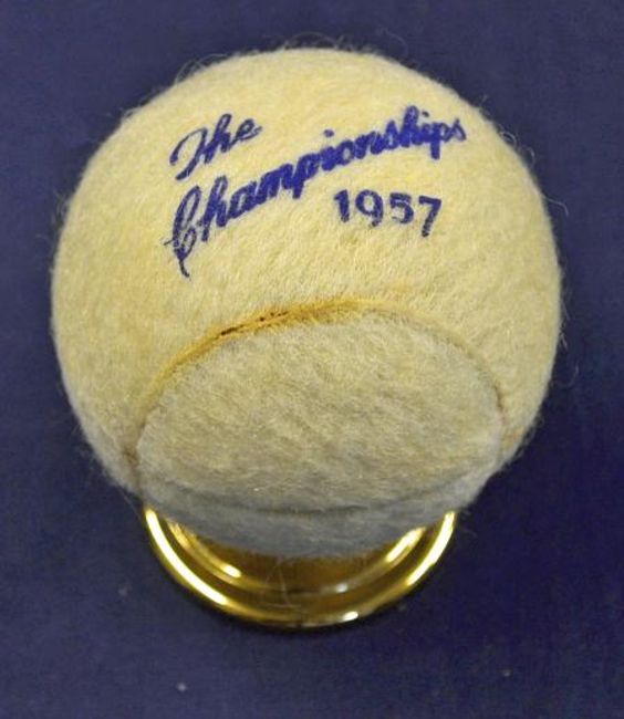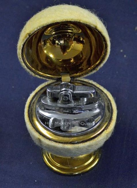 Rare 1957 Wimbledon Lawn Tennis Presentation tennis ball table lighter - comprising a tennis ball with gilt lining and inscribed to the cover "The Championship 1957" and engraved to the lighter "To Mark The Visit Of Her Majesty The Queen" mounted on gilt circular base -