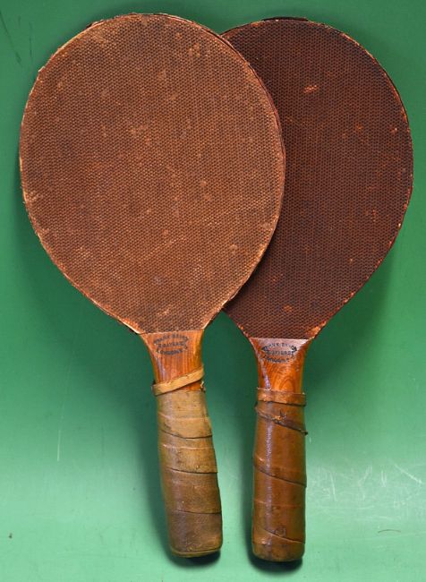 Pair of Frank Bryan table tennis bats with the makers stamped to the throat^'The Atropos' table tennis patent^ with full leather grips and pimpled design to the head which is degrading slightly but overall (F/G) (2)