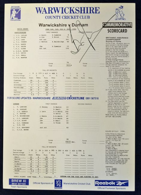 1994 Warwickshire v Durham CCC signed scorecard signed by B Lara who set a new world record of 501 not out^ and Warwickshire highest score of 810-4