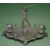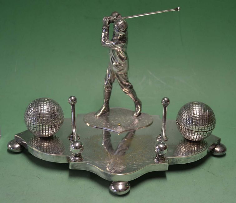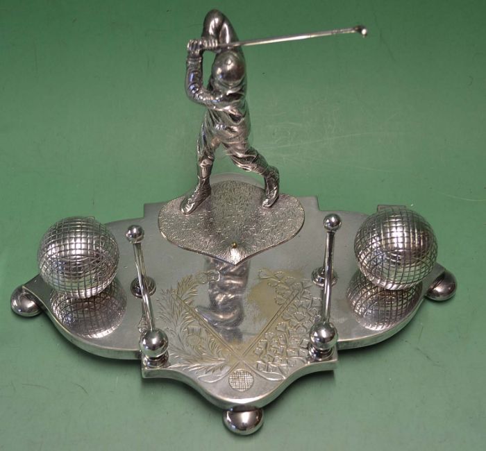 Fine Edwardian silver plated golfers inkwell desk stand - featuring fine Victorian golfer the top of his swing together with 2 guttie mesh pattern golf ball inkwells^ with replaced brass liners^ 2x pen rests - mounted on decorative stand with engraved cross Golf clubs^ guttie golf ball and floral leaves overall 6.25"h x 10.25"w quite stunning hence (VG)
