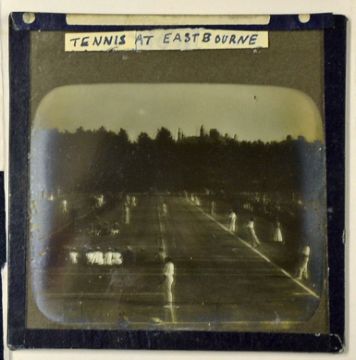 Very rare tint type photograph on metal depicting early tennis players in team clothing together with a Victorian glass slide showing tennis matches at Eastbourne measuring^ 11x8cm (2)