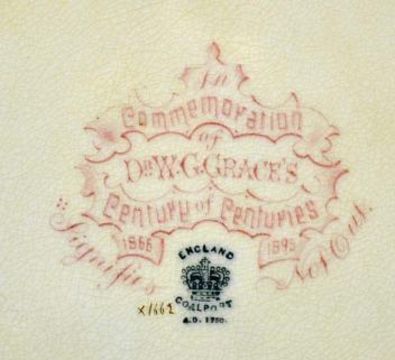 Rare W G Grace Century of Centuries Coalport Commemorative bone china plate c1895 - decorated in red with gilt border and W G Grace portrait to the centre - and on the reverse stamped with the Coalport Crown and inscribed in red "In Commemoration of Dr W G Grace's Century of Centuries 1866-1895" also in hand written in gold X1662- overall 9" - note 3 small hairline cracks some very minor crazing and discolouration to the edges. Note Ex Keith Crump Collection Sept 2006 - lot 359