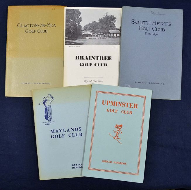 5x Greater London and surrounding counties golf club handbooks from the 1930s onwards by Robert HK Browning^ Tom Scott^ Francis James et al to include "Braintree Golf Club" c1950/60s^ "Clacton on Sea Golf Club" 1937 (Browning) together with folding course plan also advertising Willie Hughes Golf Professional with photographic image^ "Maylands Golf Club" c1950s^ "South Herts Golf Club-Totteridge" 1939 (Browning) complete with course plan^ up-to-date entries fee laid down to the title page together with a photograph illustration of Harry Vardon and "Upminster Golf Club" c1950s by Francis James - overall (G)