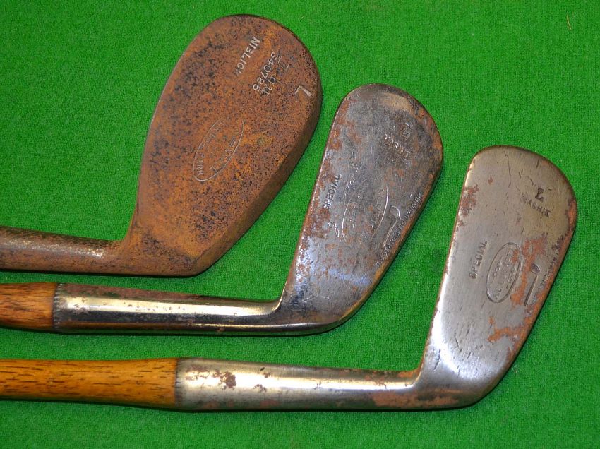 3x very playable ladies irons to incl a pair Tom Stewart mashies and a super large headed pat. niblick by Jack Randall Sundridge Park Pat "JEBU" no. 340785 c/w makers shaft stamp - all with full length grips - just need clean