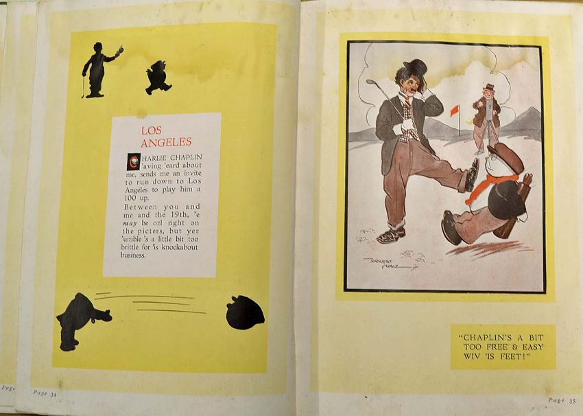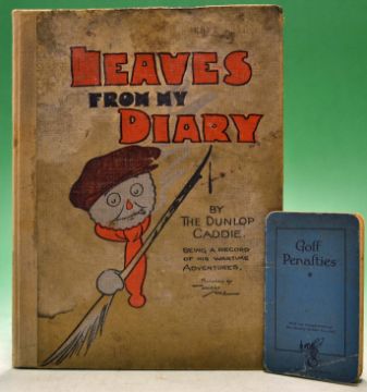 Dunlop Caddy - "Leaves from My Diary -Being a Record of his Wartime Adventures" 1st ed c1919^ published Birmingham England: Dunlop Rubber Co^ illustrated boards^ 40p illustrated by Ernest Noble (humour) - some damp damage to the covers and internally hence overall (A/F) and Dunlop Sport Company - "Golf Penalties and Etiquette" by Maxfli 1st edition c1920 published London: Dunlop Sports Company^ original pictorial cloth wrappers (16 pages)^ illustrated by Harry Rountree - general pocket wear^ some creases^ minor staple rust hence overall (F) (2)