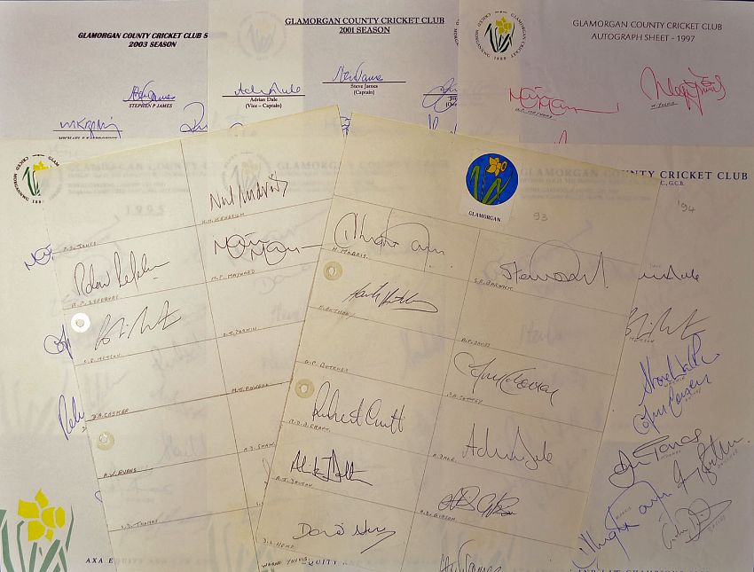 Collection of 1993 onwards Glamorgan CCC signed team sheets featuring players such as Morris^ Croft^ Maynard^ Dale^ James and more with #100 autographs (8)