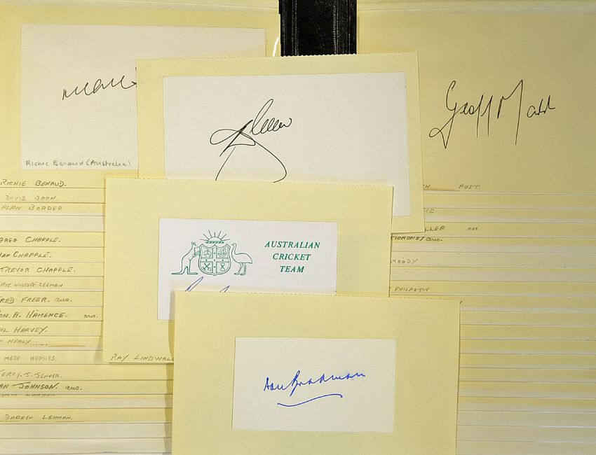 Collection of 1930 onwards Australia cricket player autographs featuring R Benaud^ A Border^ D Bradman^ G Chapple^ F Freer^ R Hammence^ N Harvey^ I Johnson^ D Lillee^ R Lindwall^ B Massie^ K Miller^ J Moroney^ K Rigg^ J Thompson^ D Walters and more 35+ in album