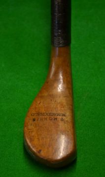 Late T Morris scare neck putter in light stained dogwood^ fitted with a whole cane shaft^ the crown of the head is additionally stamped with W Macdonald^ c/w full length leather grip and underlisting