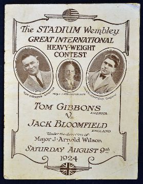 1924 International heavy weight boxing programme Tom Gibbons (America) v Jack Bloomfield (England) at Wembley dated 09/08/1924^ there is some staple rust and writing internally (F) Note: The bout won easily by Gibbons drew a crowd of 50^000^ however this experiment with boxing matches in wide open spaces was not considered a success and immediately afterwards the event organiser Major J Arnold Wilson filed for bankruptcy