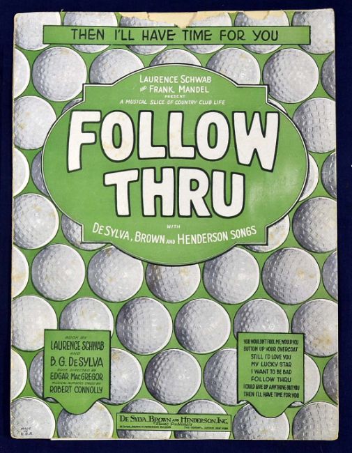 Scarce 1928 Golfing music song sheet titled "Follow Thru - A Musical Slice of Country Club Life" by Laurence Schwab and Frank Mandel - decorated with lattice and dimple golf balls overall 12 x 9" (some tears along the top front cover) plus 3x Crompton & Royton Golf Club Debenture interest payment cheques (4)