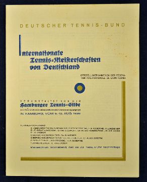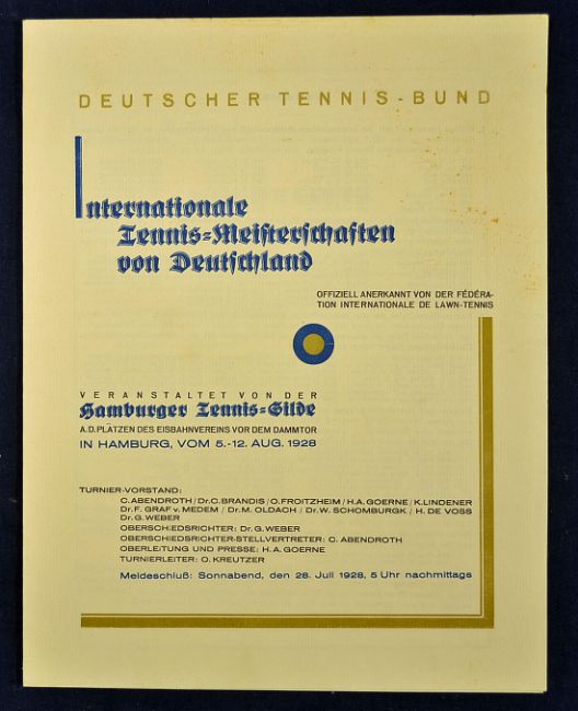 Extremely rare 1928 Tennis document from the Deutscher Tennis Bund "Offiziell Anerkannt von der Federation Internationale de Lawn Tennis"^ dated Hamburg Aug 1928. This document^ 23 x 29 cm details all the previous winners from 1892^ all the regulations for play and is in excellent condition