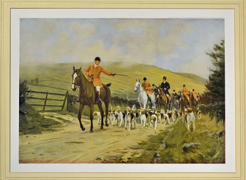Colour Hunting print'Moving Off To Draw' the Lanark and Renfrew foxhounds from the painting by C. E. Stewart^ printed and published by Eyre & Spottiswoode^ with no frame measuring 60 x 49cm
