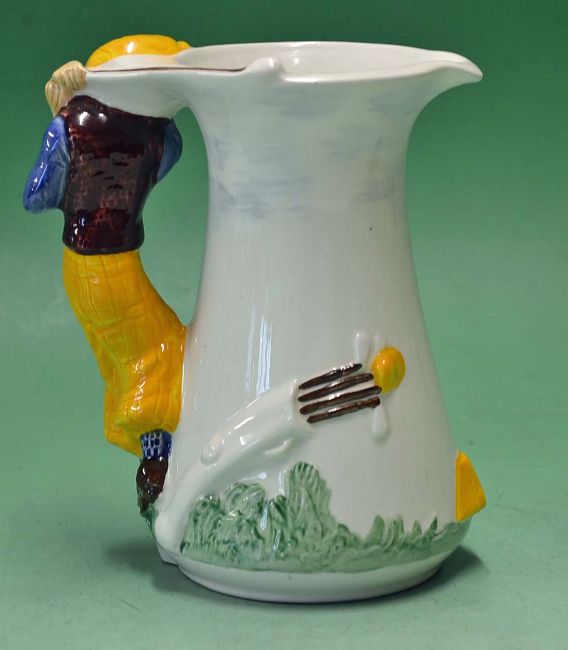 Late Burleigh Ware 'Golfer' jug of tapering shape - sparsely painted glazed bowl with hand painted golfer handle with golden brown hatched trousers and hat^ hickory golf clubs and tee box approx. 6"h - printed factory name to base "Burleigh-Ironstone - Staffordshire England fresh condition.