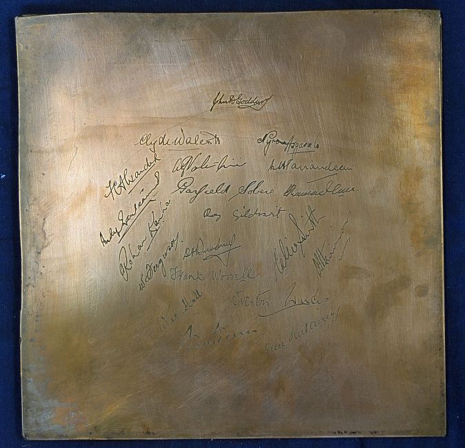Rare 1957 West Indies cricket tour copper engraved plate comprising original copper plate used by Royal Worcester in the production of the bone china plates to commemorate their visit to England in 1957^ with facsimile signatures cut into the front^ c/w Royal Worcester imprint number 4104 on the reverse measuring 7"x 7" Note: The plate is sold for decorative purposes only and cannot be used for reproduction purposes. The first plate was produced in 1938 and continued until 1973 and were produced in limited numbers for presentation to each member of the touring team during their visit to the factory in Worcester