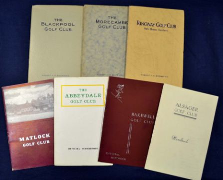7x North of England golf club handbooks from the 1930s onwards by Robert HK Browning^ Tom Scott^ et al to include "The Abbey Dale Golf Club - Sheffield"c1960s^ "Alsager Golf Club" c1940/50s^ "Bakewell Golf Club" c1950s^ "The Blackpool Golf Club" c1936 (Browning) c/w folding out course plan to the rear^ "Matlock Golf Club" c1960/70s^ "The Morecambe Golf Club" 1933 (Browning) and (Ring way Golf Club^ Hail Barns^ Cheshire" 1935 (Browning) c/w folding course plan - overall (G)