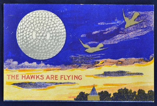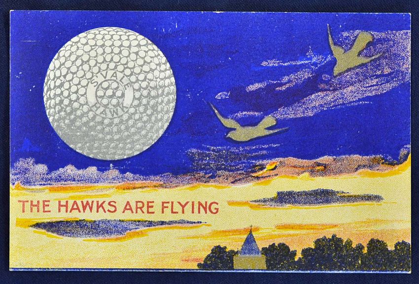Scarce Springvale golf ball coloured postcard titled "The Hawks are Flying" - S'Vale Hawk Bramble Golf Ball. Ball in the air with bright blue sky and birds flying alongside ball. Unused.