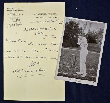 1953 signed letter from H D G Leveson-Gower on headed note paper'Beardsley & Co Stock & Share Brokers' dated October 3rd 1953^'My Dear^ I am so sorry they were not sent before. I hope you have not been inconvenienced' signed H.D.G Leveson Gower^ t/w a postcard of C.B Fry (captain) Sussex unsigned (2). Note: Sir Henry Dudley Gresham Leveson Gower^ an English cricketer who played first class cricket for Oxford University and Surrey and captained England in Test cricket. His final first-class match was for his own Team v Cambridge U in 1931. He captained the MCC team to South Africa 1909/10^ leading England in three Tests on that tour. In 1953 he was knighted for his services to cricket.