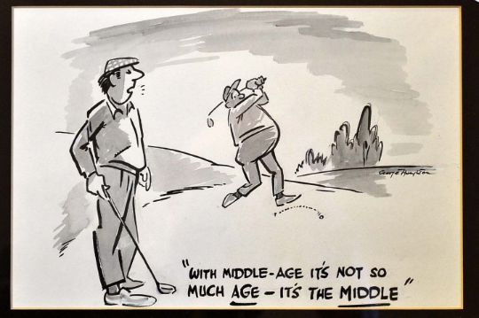Houghton^ George (1905-1993) - 2 original signed pen and ink golfing cartoon illustrations - complete with annotations and signed "It's clear to me why you have lost your pivot" and "With middle-age it's not so much age - it's the middle" both mf&g overall 11.25 x 14.25"
