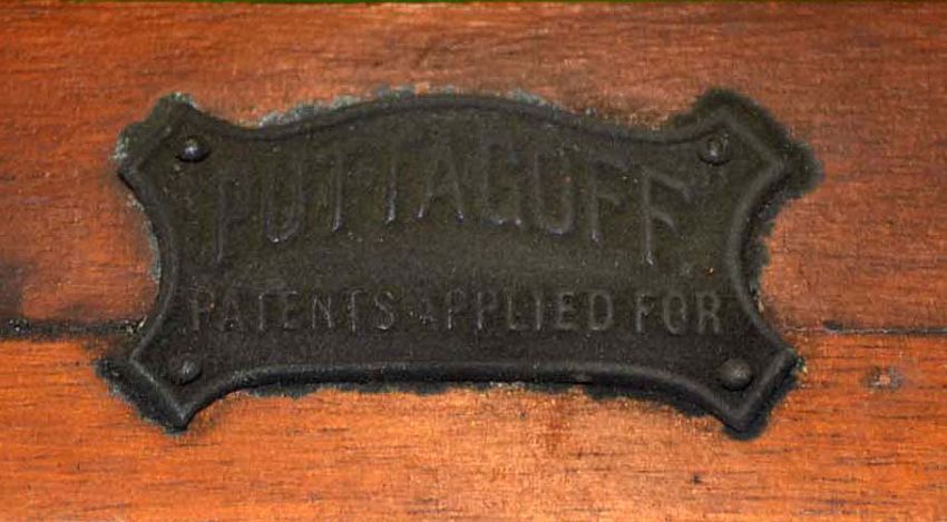 Scarce Puttagoff Pat Appl'd for indoor practice putting aid - comprising a mahogany frame^ inlaid steel band and brass ring - c/w makers metal plaque - overall 2.25"h x 27"w