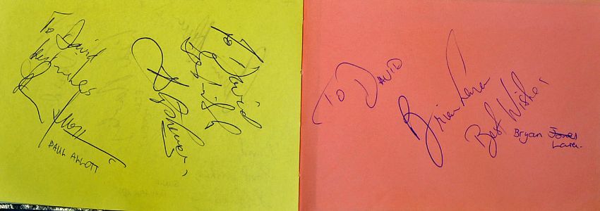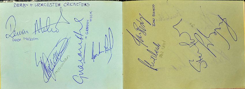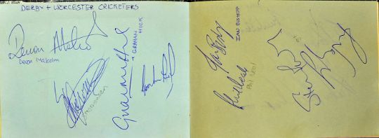 Heavily signed cricket autograph album including cricket and football players to include David Gower^ Graham Gooch^ Les Taylor^ Bruce French^ Neil Foster^ Allan Lamb^ Ian Botham^ Bryan Lara^ Gordon Greenidge^ Graham Hick^ Ian Bishop^ Phil Neal^ Steve Bruce^ Kevin Keegan and many more^ over 55 signatures all clear within album