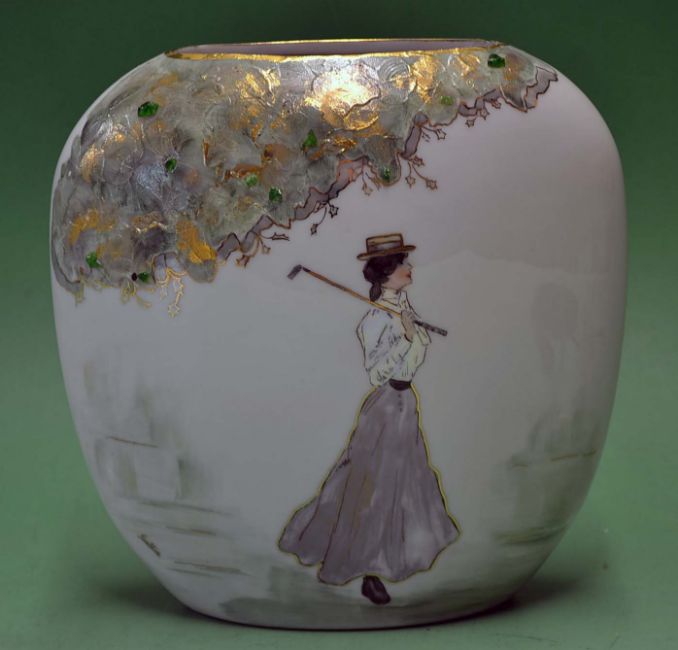 Lustre ware vase with a hand painted figure of Vic lady golfer signed by artist Sallie - set against a green back ground - overall 7.5"h