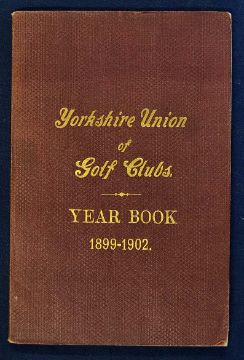 1899-1902 Yorkshire Union of Golf Clubs. Year Book - in the original brown and gilt cloth wrappers - detailing Accounts^ General Regulations^ County Champions from 1894^ Champion Teams^ County Matches^ and details of all 26 affiliated golf clubs from Abbeydale to York - in all 64pp. Cloth.